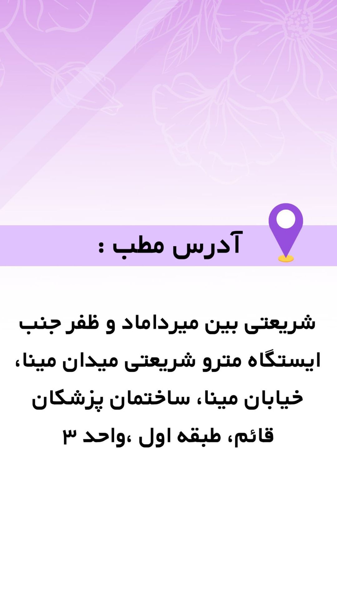 متن آگهیشماره تلفن آدرس دکتر پریسا نخعی جراح فوق تخصص چشم شریعتی - بازار من آدرس مطب : شریعتی بین میرداماد و ظفر جنب ایستگاه مترو شریعنی میدان مینا خیابان مینا ساختمان پزشکان قائم طبقه اول واحد ۳ |